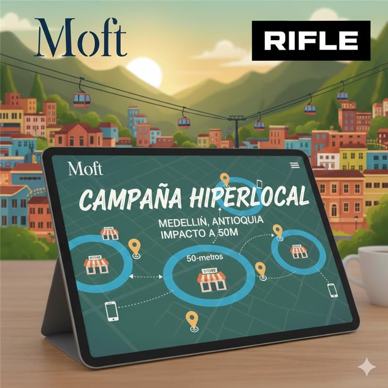 45% de usuarios consumen video a diario.Resultados reales que nos validawifi_tetheringTiempo realMomento ClavePara nuestro cliente RIFLE y MOFT, desarrollamos una estrategia de hiperlocalización, impactando audiencias en un radio de tan solo 50 metros alrededor de sus puntos físicos en diferentes centros comerciales de Medellín. casos de éxito quiero vivir la experiencia📍 El objetivo: Llevar tráfico a sus tiendas físicas.